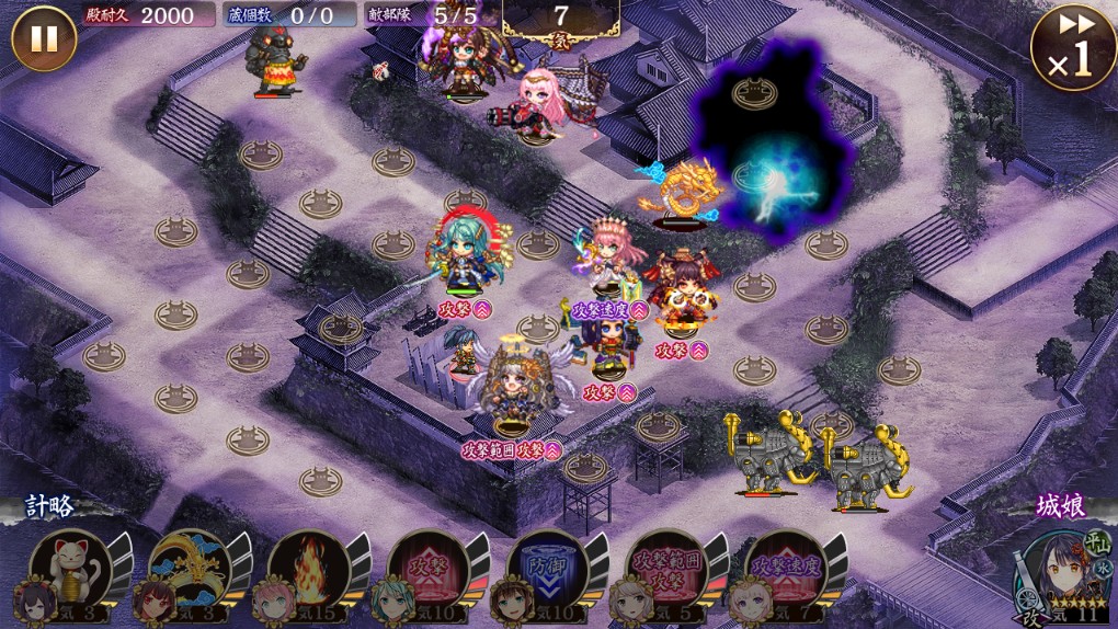 戦功1のみだけど、超難クリア。さっさとプラハ城を最大化して火力を確保して、象やら河童を姫路城の計略で倒し、徳川大坂で盤面を固めたり、モンサンで攻撃と回復を確保する。ガトリング蜂は左から出てくるのを焼けばいい。武神藤堂高虎は姫路城と錦城の計略で倒せばOK。