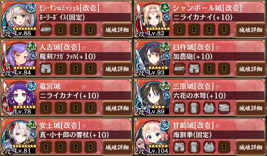 クリア編成、結局はレア度とレベルの暴力だった。なかなかクリアできなかったけどここで「近接4人は必須、配置は遠距離の後で」と書かれていたのでその通りにしたらすんなりクリアできた。序盤の河童ラッシュを安土&臼杵&モンサンで受け流したらあとは三原、竜宮、シャンボを設置し、人吉と甘崎は蜂が出てくるあたりから設置って感じだった。