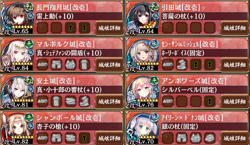 全戦功、三倍速、撤退再配置無し、全員最大化 無気力だけどぱっと見行けそうな気力量だったからやっただけで縛ってる訳では無い。 長月が巨大化3回で覚醒を迎えるドナンを支える、最大化ボイスに恥じないいい仕事した。&color(White){公認ハーレム};