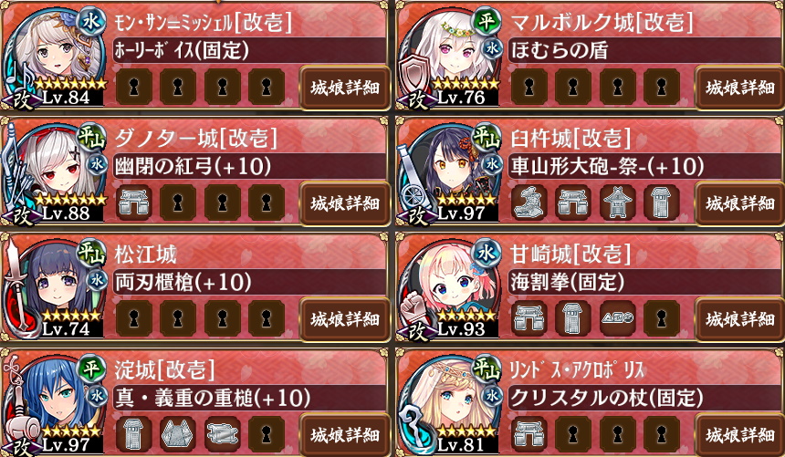 全戦功同時クリア編成できた。再配置なし。23臼杵20モンサン21リンドス22松江25淀19甘崎、3w開始時に10ダノター、高虎始動直前に18マルボルク。高虎4ロック攻撃後にリンドス最大化でギリギリ倒せました。