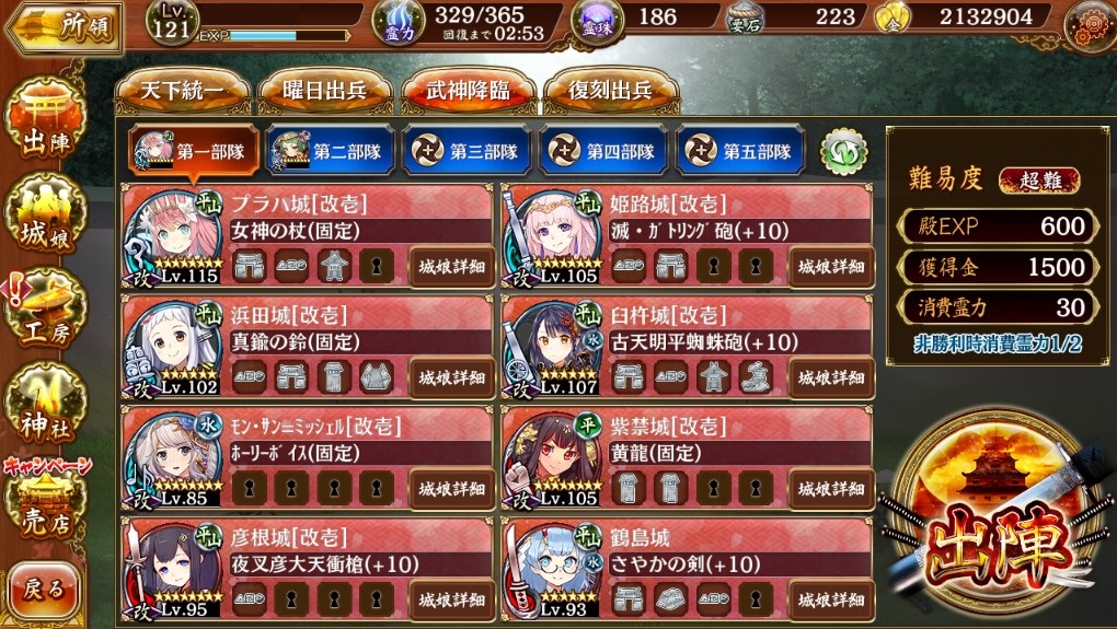 戦功2までだけど、こんな戦力で。とにかく序盤の河童を凌ぐために防御無視攻撃ができる城娘を育てて序盤の河童を凌げば、後は楽。武神高虎もプラハを3倍速にすればすぐに討ち取れる。