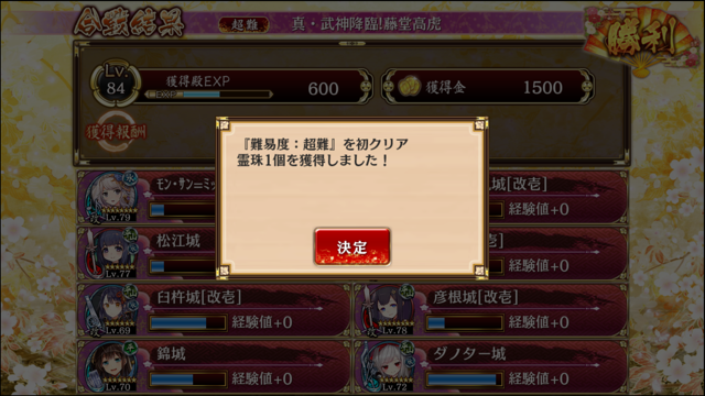 戦功1のみだがなんとかクリア!倒しきれない難所は指月伏見の竜巻でのりきって高虎さんはダノター錦モンサン計略でフルバースト。水札杖がリンドスと平戸しかいなくて、錦outリンドスinで松江モンサン計略総攻撃だとミリ残りで更地にされてしまったから水染めは今一歩届かず。