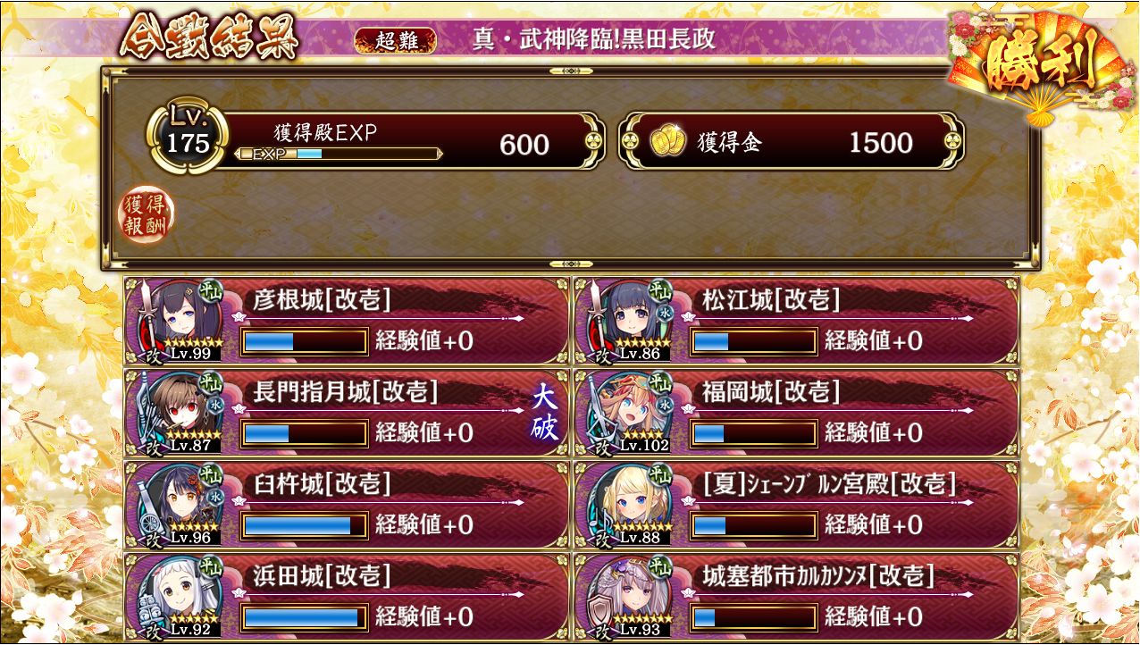 えー木主です。手つかずの長門指月がデバフ使えるのに気づいて松江と一緒に育てて勝てました・・・。起爆用トークンほぼ無しで夏シェーン使って爆弾トッパイ遅延させたり綱渡りでしたが、チケットは使わずに済みました!(ダブリ☆6城消えたけど)