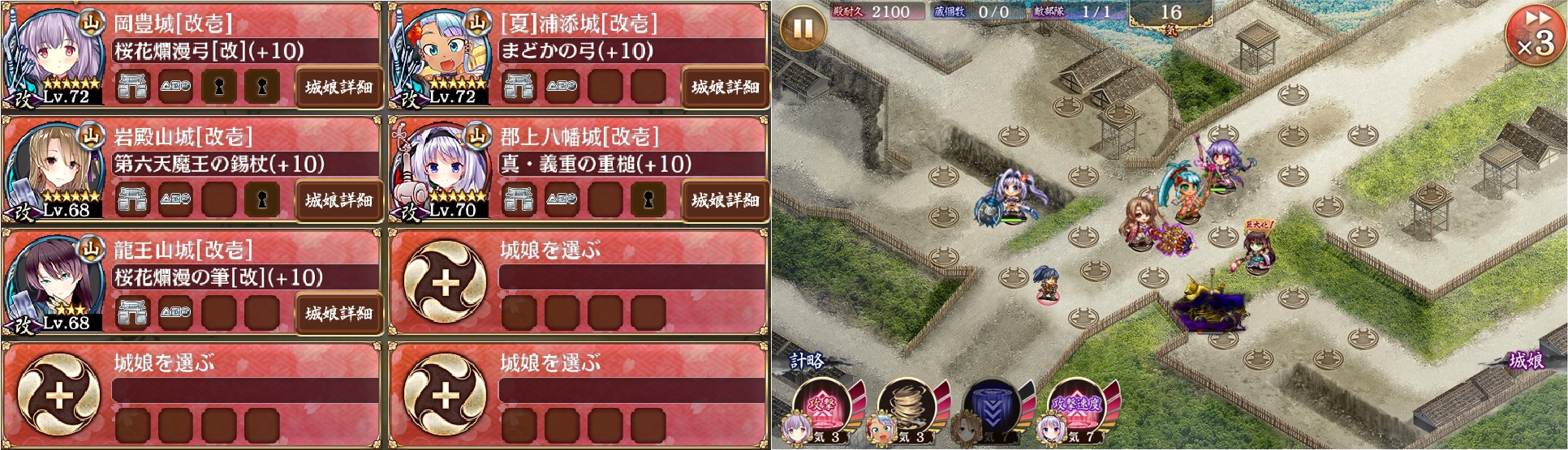 開始したら編成順に大槌まで配置→岡豊、夏浦添、岩殿山の順に特技発動→直後に一ノ谷型兜が右からやって来るので大槌の計略を弓と岩殿山に使って対処→弓持ちの大型飛行兜を倒したら龍王山を設置して1回巨大化→大槌の特技を発動。
