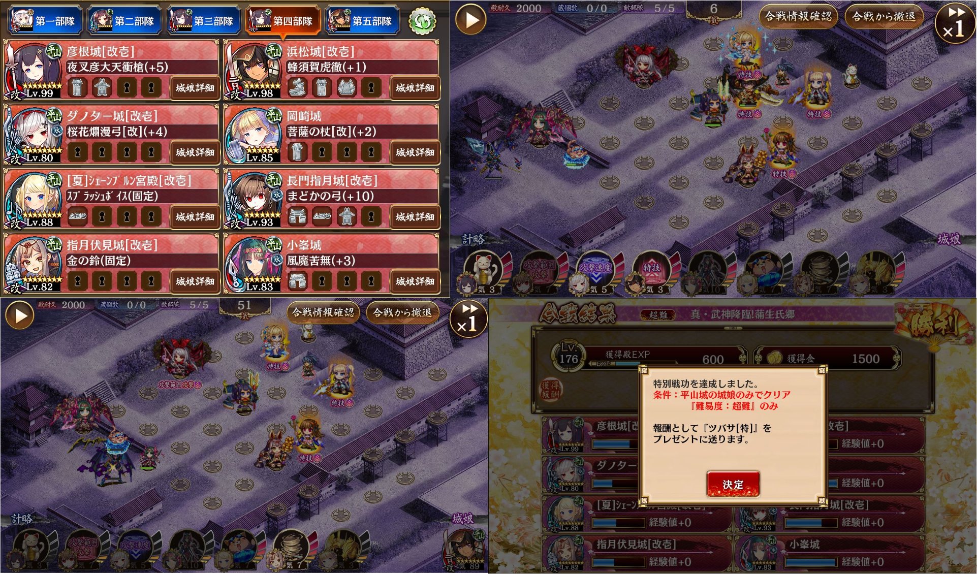 火力不足など諸々考えた上で倉庫の3周年召城符を開封し指月伏見を投入。平山限定2戦功で終了。旧城からやってきて稲荷山を攻略できなかった身ゆえどうしても勝ちたかったからこれで勘弁を。道中18・27辺りに音楽隊配置は割と前の構成から獅子対策に使ってますねぇ。