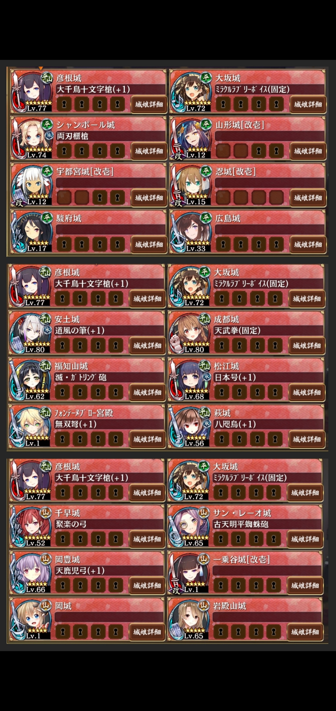 皆さんありがとうございます。個人的な候補が近接ならノイシュかウィンザーかキャメロットか琉球か紫禁、遠距離なら安平か聚楽第か万里か姫路か金亀かロンドンかダノターという感じに多すぎて決めかねてまして...。とりあえず大阪とひこにゃんには出張してもらって属性毎に分けてみたんですけど、何が足りないやらさっぱりです...。もう少しだけ御教授お願いします!