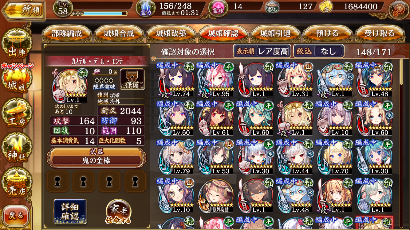 初期のアイギスコラボからほぼログイン勢な物です。アイギスの方がある程度やれることが終わったのでこっち側を楽しんでみようかと思い、天下統一44章でクリアが出来なくなったので、ここにご相談をしました。聚楽第は1凸、改7の2人は6の状態が1凸のキャラがいるので、改築素材にしようかと思っております。レベルが足りないのは重々承知の上で質問です。今の手持ちから優先的に育成をしておくべきキャラを教えて頂きたいです。