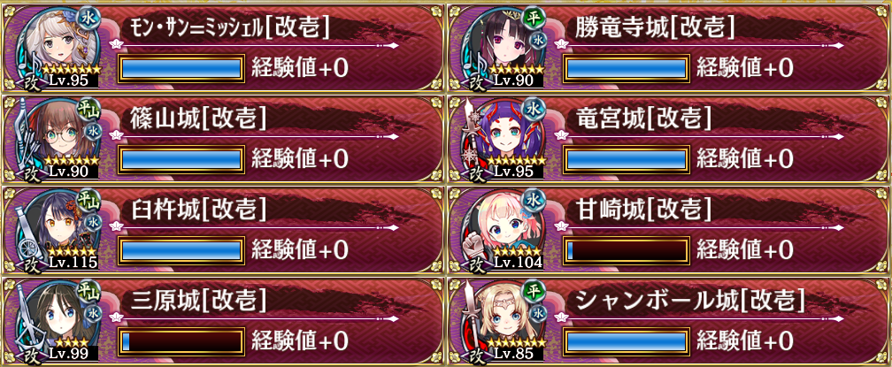 3戦功同時クリア編成。ほかの人も言ってたけどモンサンと竜宮の計略常時展開が強すぎる。臼杵はやはり安定の気生成要員。シャンボの計略は大物が来た時用。甘崎と三原は中国四国要員だがここは該当者であればだれでもいいかもしれない。篠山も高火力遠距離なら誰でもいいと思う。勝竜寺は何となく入れているがここでW歌舞クリアの例が何件か挙がっていたのでありなのだろうと思う。核であるモンサン&竜宮がいれば編成自由度は高いのかもしれない。