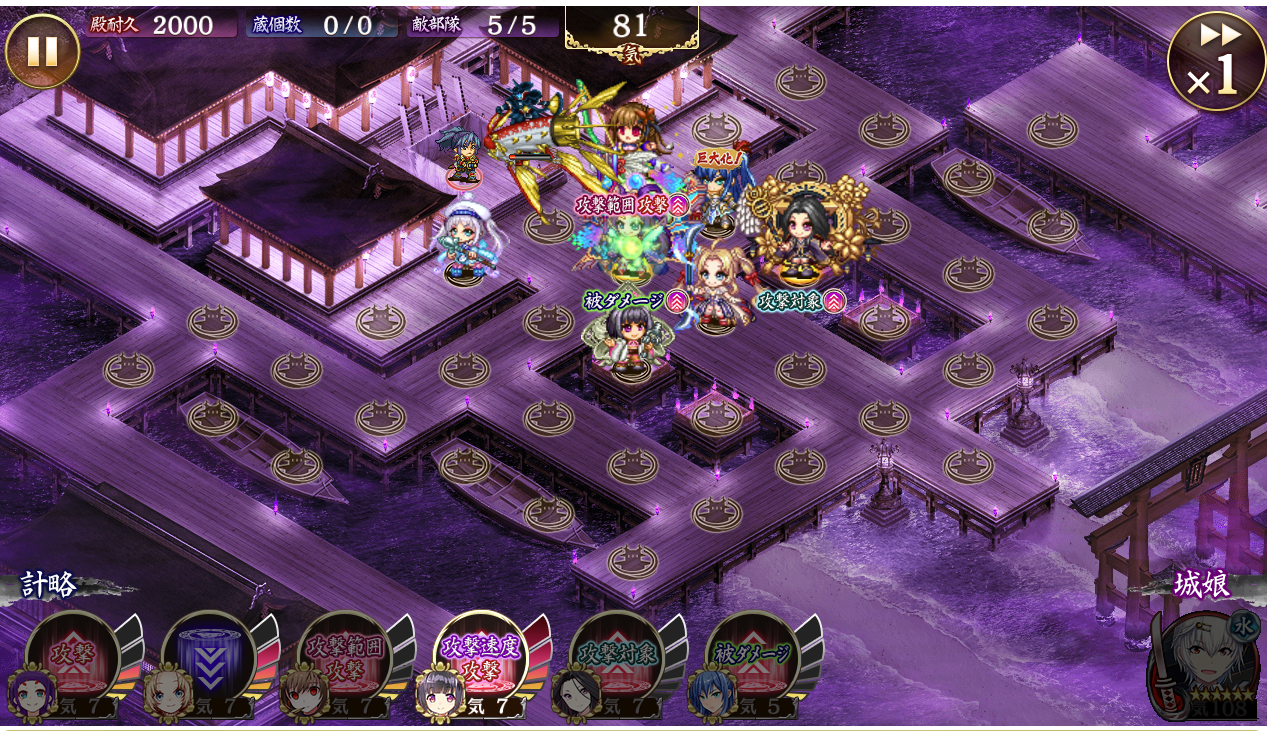 初手全員配置で吹揚は殿前。遠距離から置き、近接竜宮吹揚淀城シャンボールの順で置く。 【W1】シャンボールと竜宮最大化。【W2】伊勢長島を一回巨大化、天狗動き出したら竜宮計略、伊勢長島を3まで巨大化。天狗倒したら気トークン6に置き直し。【W3】室町第を4回まで巨大化、だたら3連に竜宮計略シャンボ計略で対応。室町第最大化。人魚にドナン倒されないよう淀城計略、一回巨大化、長門指月を巨大化(出来れば最大化)【鯨】が動いたら竜宮計略、シャンボに淀城計略、長門指月の特技で保たせる。吹揚を一度巨大化。鯨倒せたら吹揚最大化ドナン特技直前まで巨大化を目指す【w4】ようやく安定するので適度に巨大化。【w5】毛虫2体の時、ラッシュ時に竜宮計略。