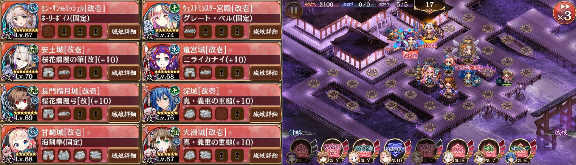 設備は基本的に星3だが、今回は星4多め。星4は札の門(+20)。槍の門(+20)。弓の門(+20)、狭間(+12)。淀の井戸(+13)、拳の門(+18)、堀(+13)、石垣(+220)、井戸(+13)。大洲の石垣(+240)、井戸(+13)。