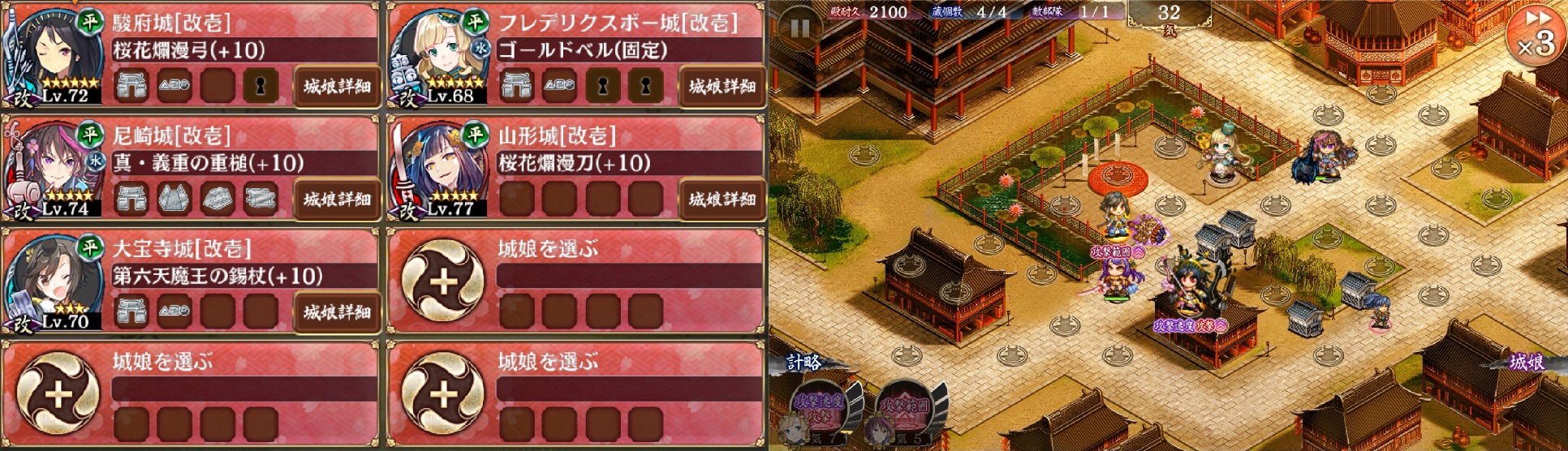 開始したら、編成順に刀まで配置→弓の特技発動→鈴を3回巨大化→刀、大槌の順に特技発動→上から象がやってきたら鈴の計略を鈴自身に使用→(続く)