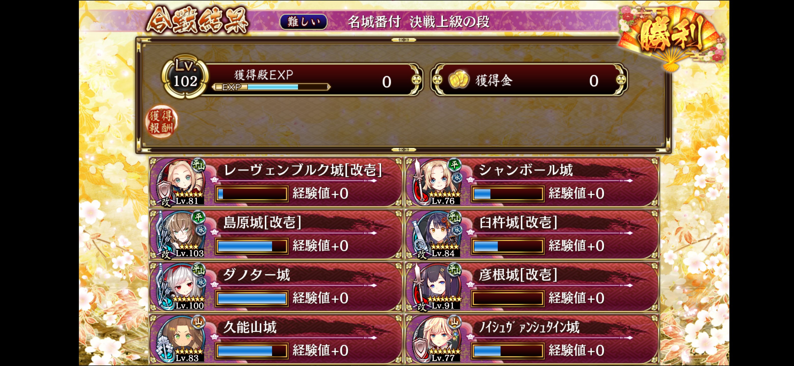 やっと委任解放出来た!諦め半分のやけくそでやってたけど7臼杵5久能山1彦根33島原34ノイシュ39シャンポール35ダノター25レーヴェン30、31に招き猫。ぶっちゃけ、うちだと歌舞より回復も攻撃も出来る祓串じゃないとクリアできなかったからレベルが高い久能山で代用。盾もレベル高い二人で代用。シャンポールが良い仕事してた。ヤドカリとかのタゲ取りしてくれたり。