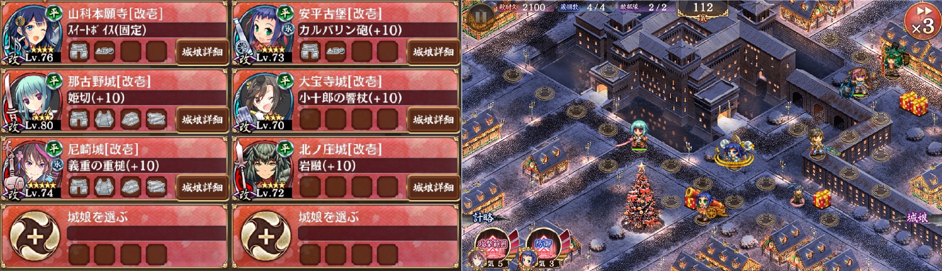 札は対妖怪相手に必要な城娘だが、攻撃の値が少ないと特に序盤の黒サンタのトッパイ型兜を倒せないかもしれないので、レベルを上げたり施設の門を付けて攻撃の値を調整すること。また2体目の黒サンタは、速やかに札の特技を発動させておけば足止めする槍が大破する前に処理できる。