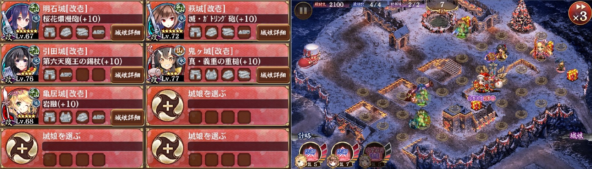 第一波終盤の赤サンタトッパイを大槌で足止めすることになるが、ギリギリの戦いになる。星がもう少し高ければ余裕があるが、鬼ヶ城の能力だと推奨されている80レベル近くに達していないと大破するだろう。巨大化ボタンを連打するくらいでやればちょうどよく耐久を回復できる。