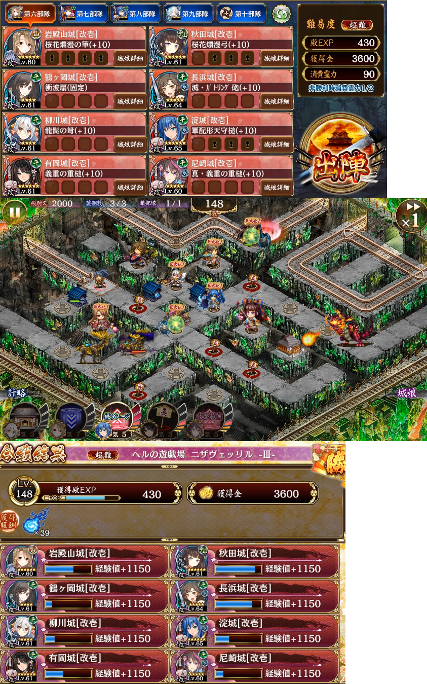 離間はファヴに3回(宝石車壊し2回と大鯉のぼり削り1回)、有岡に張り付いた最後の小獅子3匹に1回、計4回。淀計略は3連小爆弾用に有岡→大獅子用に尼崎→5連小爆弾用に有岡→3連大爆弾用に有岡→ファヴ用に淀、計5回。