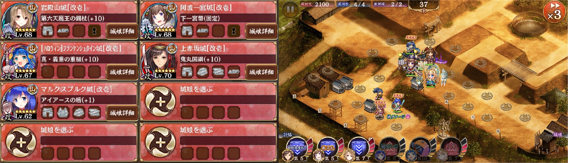 開始後、編成順に城娘をすべて配置→刀を4回巨大化→アテナイ・アクロポリスを4回巨大化→アテナイ・アクロポリスの計略を杖自身と祓串、大槌、刀に使用→刀がヘラジカ兜を攻撃し始めたら、アテナイ・アクロポリスの特技発動→第一波が終了。