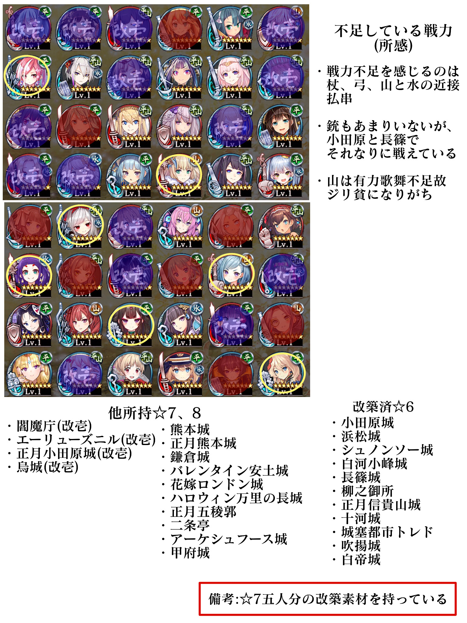 チケット交換で悩んでいるものです。頭星2くらいの殿であるせいか絶や武神難で苦戦してばかりなので、この機会に育成に力を入れようと考えています。戦力を書き出してみたりしていろいろ考えたのですが、どうしてもこれ以上考えがまとまりません。質問したい事項は(1)塗りつぶし丸印のついていない未所持勢から3人取るならば誰がいいのか(黄色丸は個人的に考えた有力候補)、(2)杖の性能についてはいまいち実感できていないが、この中で黄色丸以上のオススメとなるものはあるか、(3)払串の星7を取らず既所持を鍛える場合、室町第と久能山城のどちらの改築を優先すべきか、(4)星7改築で優先すべきは誰か、です。