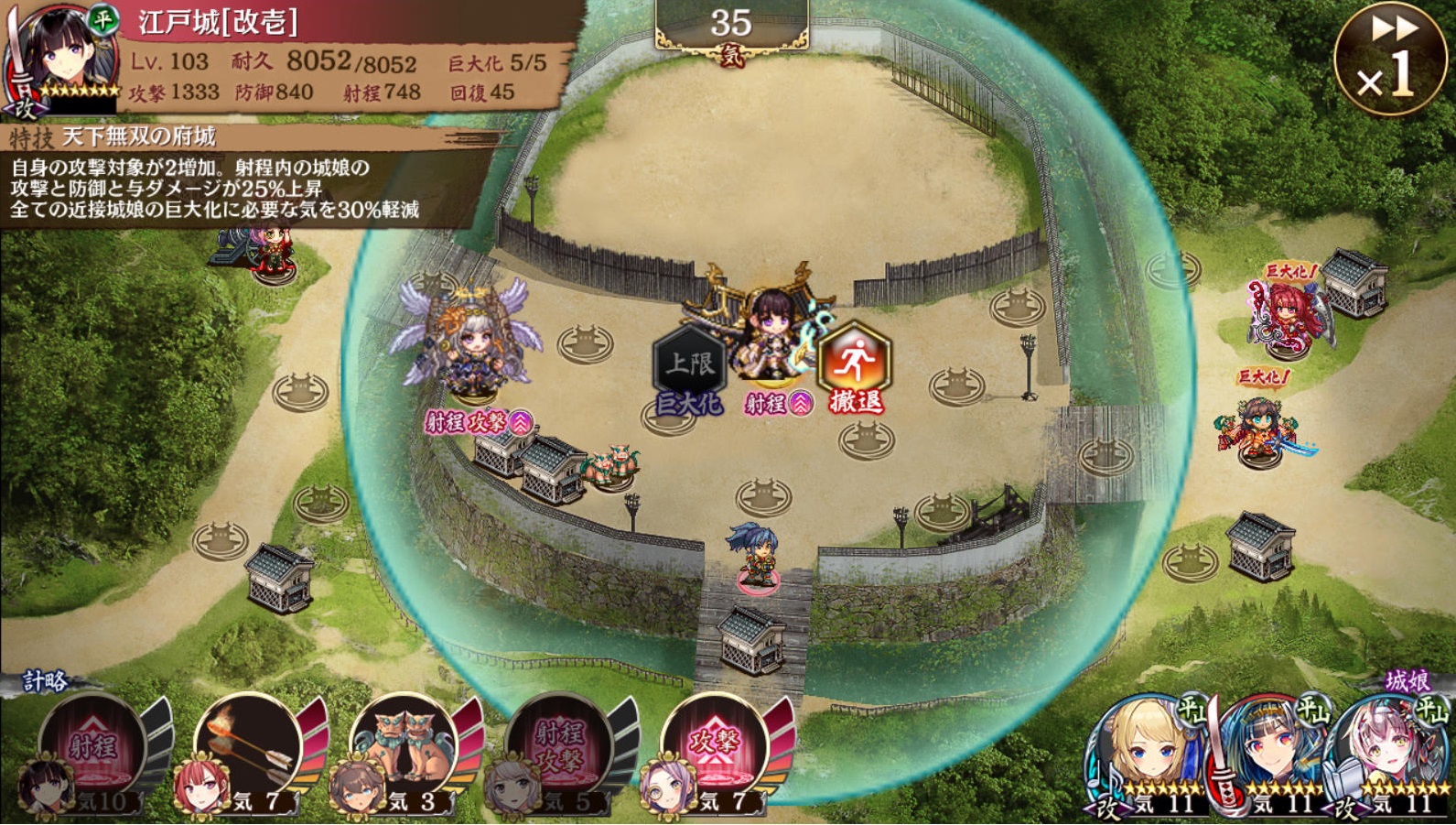 記念の10連符でやっとお迎え出来たから、交換した江戸城さんと一緒に使ってみたけど、これマ? 画面の半分が攻撃範囲で五体同時攻撃で、しかも計略短縮効果があるから永続的に効果が続くとかナニコレ。みんな今までこんなずるいキャラ使ってたの?