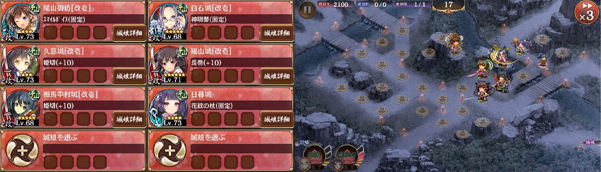 開始したら、編成順に配置(順番厳守)→福山、久慈、相馬中村、祓串の順に特技発動→歌舞を2回巨大化→杖の計略を久慈に使用→祓串の計略を使用→杖を1回巨大化→歌舞を1回巨大化。
