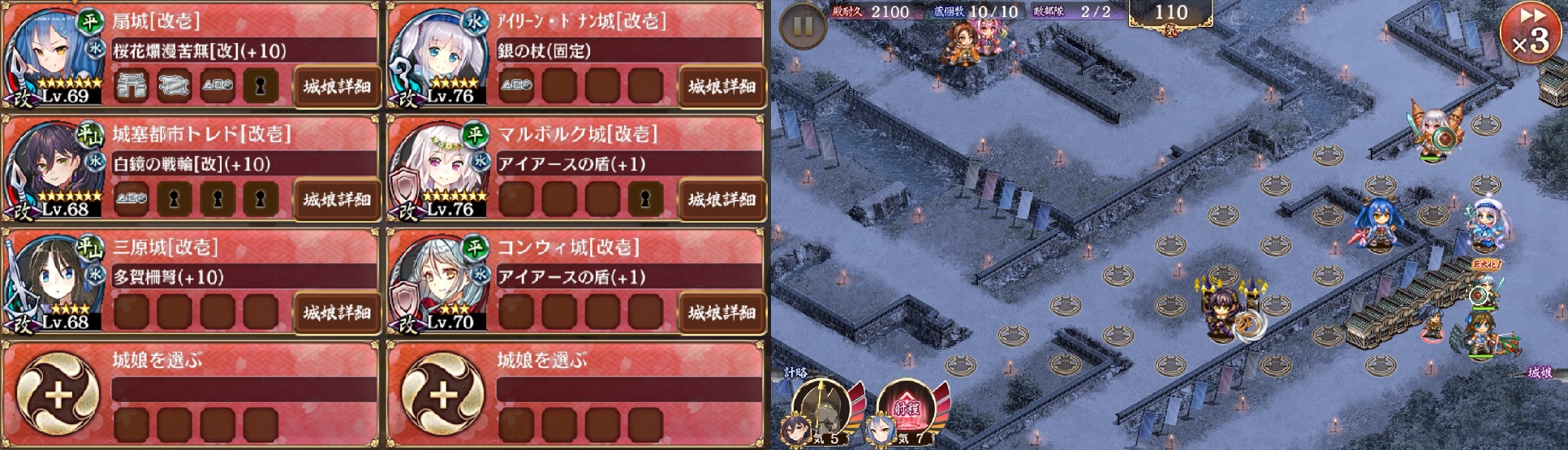 設備は基本的に星3。星4は扇の門(+20)、狭間(+12)。トレドの狭間(+12)。扇に井戸を付ければ削られた耐久を自然回復できるが、なくて達成できるはず。