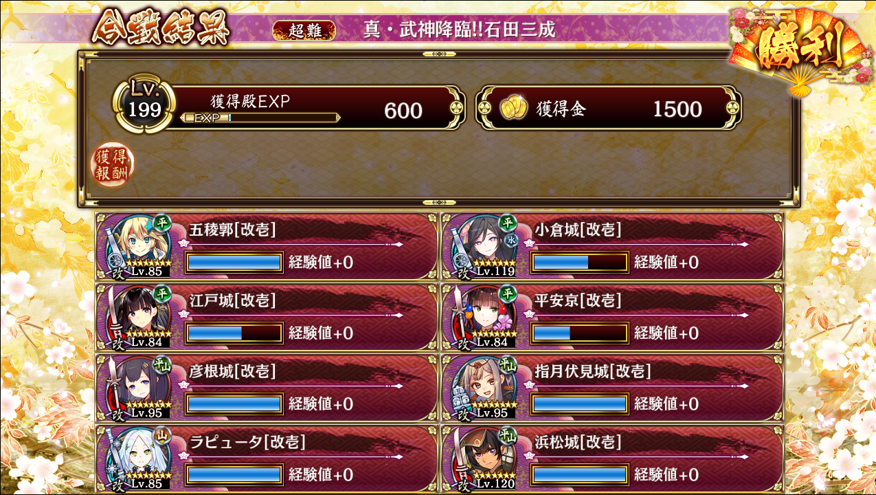 レベルはこんな感じ。ひこにゃん指月伏見は95、あと最高レア4人は全員限界突破なし。指月伏見はレベル上の地形一致の平鈴の方が当然能力上になる。最初突破しようとした時のバレンタイン高島(改で6)の方が強かった。まあうん、完全に趣味です。
