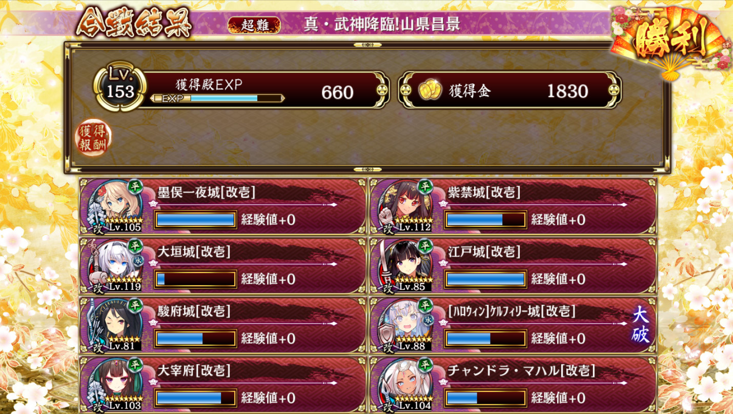 32江戸28チャンド35紫禁24駿府23墨俣33太宰府31ハロケル22大垣で再配置なし3枚抜き。江戸チャンド最大後駿府とW串で戦線安定させて騎馬は大垣計略、強化毛虫はドラゴンさんとトークン囮、強化相撲は姿が見えた瞬間ドラゴンさんで削って後は力押し。ハロケル大破したけどギリギリクリア。
