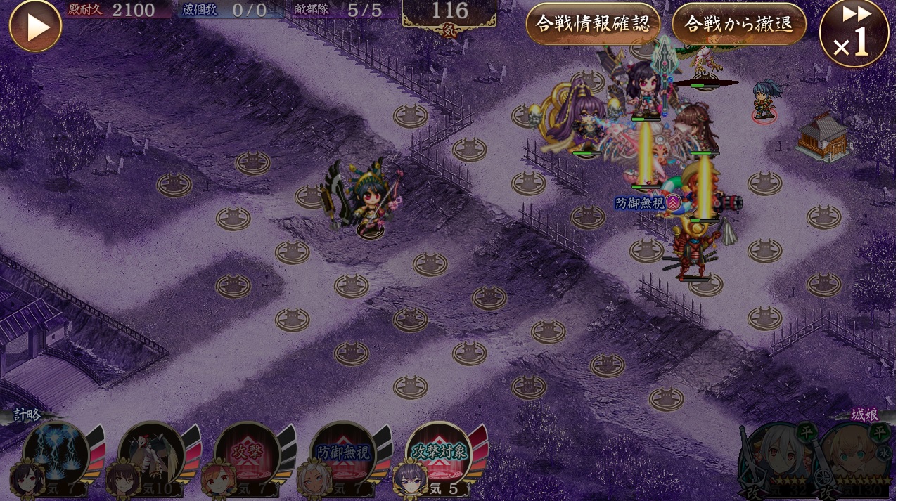2W目 25駿府、雑兵と天狗と当世騎馬を巻き込むように雷(上からきた騎馬に最速で鈍足をあてるため)33夏富山1回巨大化、青天狗がきたらママ計略。駿府撤退後ドゥブロを2回巨大化、青天狗がきて1回攻撃を空ぶったら同じ位置に駿府。4回目で倒される前に空蝉。以後下から来る天狗は同じ手順。鳥は置かない。