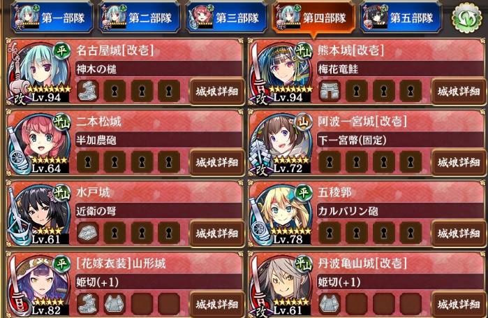 今月中旬からゲーム開始。32・40・42で難渋してようやくここに到達。普通で名古屋城の「天下泰平」で飛行兜3つまでなんとか倒せるレベル。かなり人材が乏しいけどこのメンツでクリア出来る方法アドバイスもらえないかな?今イベントやってる、山形城、亀山城、秋田城も投入するくらいまで育成中。