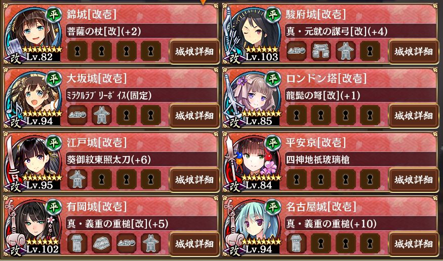 ギリギリで3枚抜き達成。改築渋ってたら最後押し切られたのでロンドン塔改築してこの編成を投入したら終盤難所を超えて踏破。W2の騎馬隊が鬼門ではあるが、そこを抜ければどうにでもなる。山県を早く倒しすぎてロンドンが殴られそうになったが。