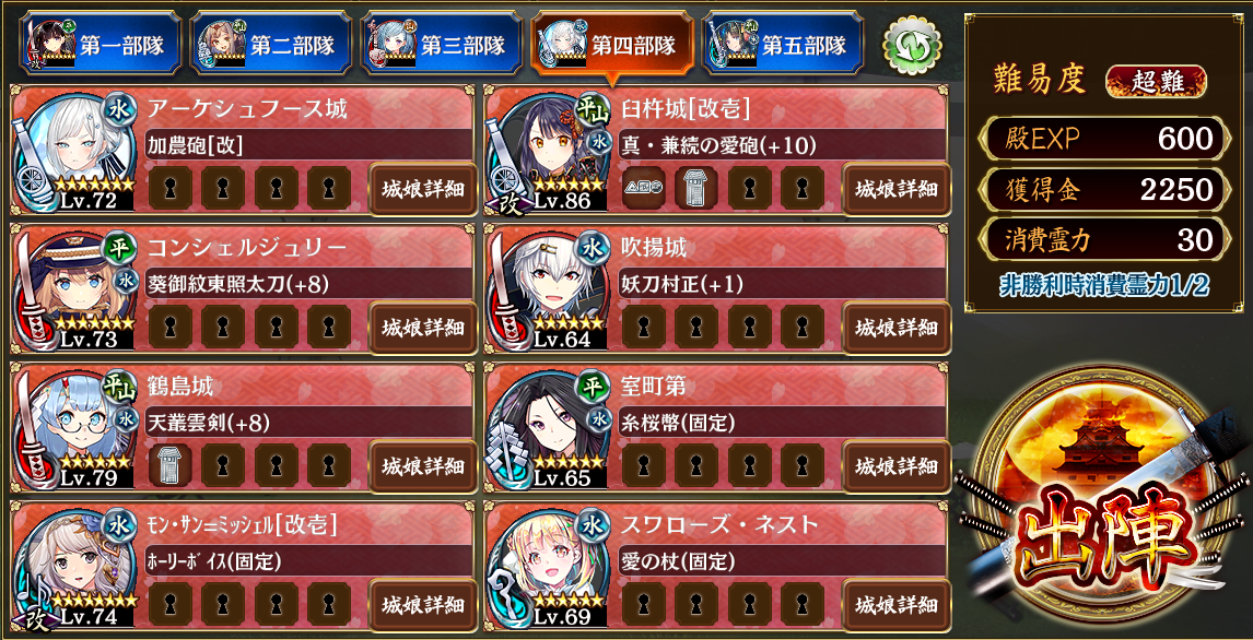去年の年末からの駆け出し殿ですが初めて3つの戦功取ることが出来ました。 10回程リトライしてスキル回し含めギリギリ倒しきれる形でしたが、今週の珠にモンサンが居なければ自分には不可能だったと思います。 そしてたまたま持ってた四国勢に感謝…