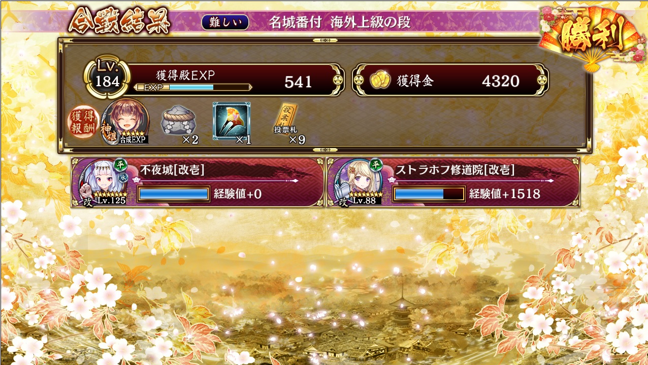 海外上級難はストラホフとペアで蔵殿無傷だった。不夜城は計略未使用、ストラホフは空中の敵にだけ計略使用