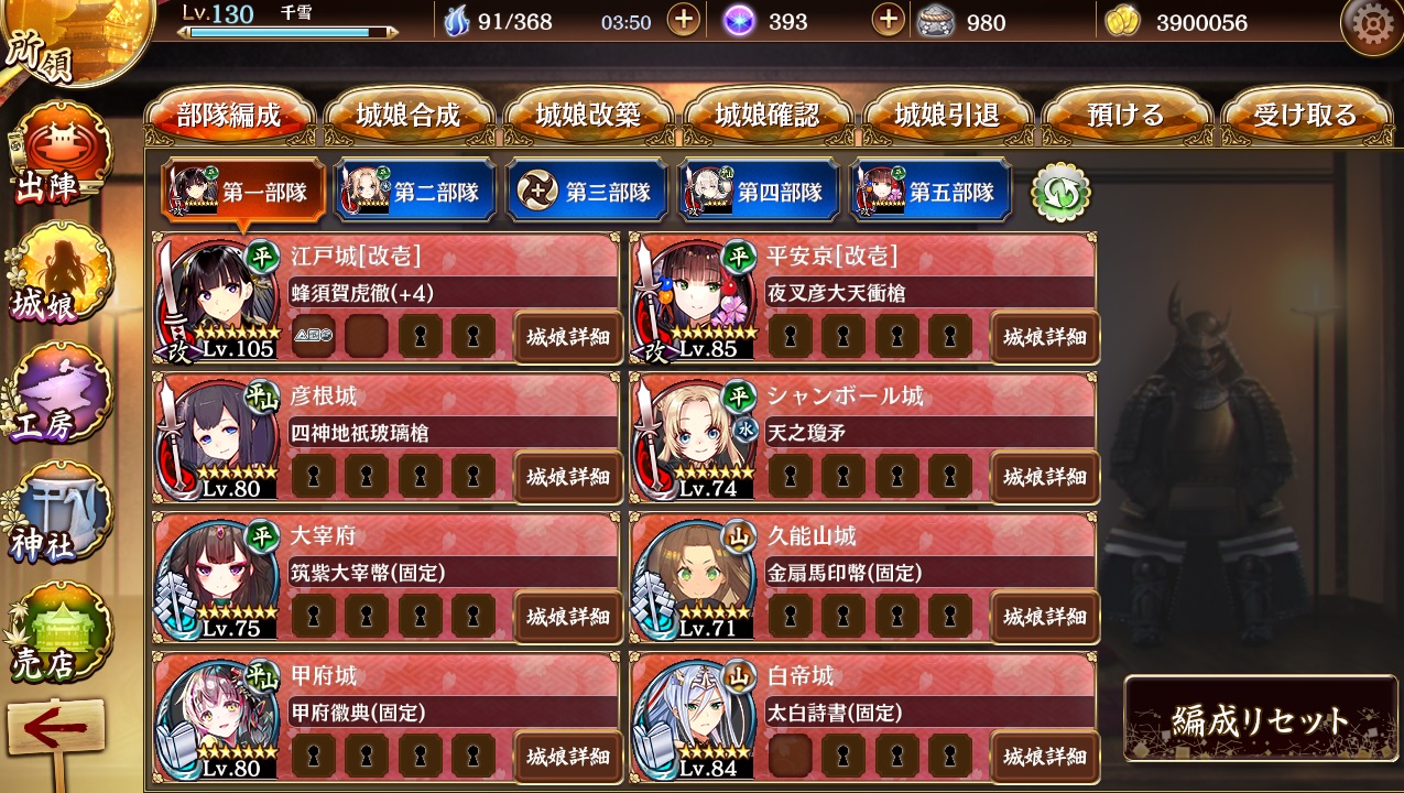始めて半年な殿の地形効果無視、とにかく負けない、勝つことだけを目的として組んだつもりの編成です。いくらかなり強い☆6城娘が多くいるとはいえ、元の☆がオール7の編成には到底およばないと思っていたのですが、甲府と白帝のコンボが、ノックバック無効以外の敵にあまりにも刺さり過ぎて、その自信がなくなってきました。ともあれ、自分のプレイスイタルは、近:遠の比率が4:4。それと、江戸・平安・甲府は、強さ&気稼ぎ要員的にできれば外したくないと思っています。以上の内容と、そろそろ溜まった千狐珠を消費したいということもあって、この編成より明らかに強いと思える地形効果無視、オール☆7の組み合わせをどうぞお教えください。公式「あ~白帝城、御城賞の特典でさらに強化しますのでー」…え?