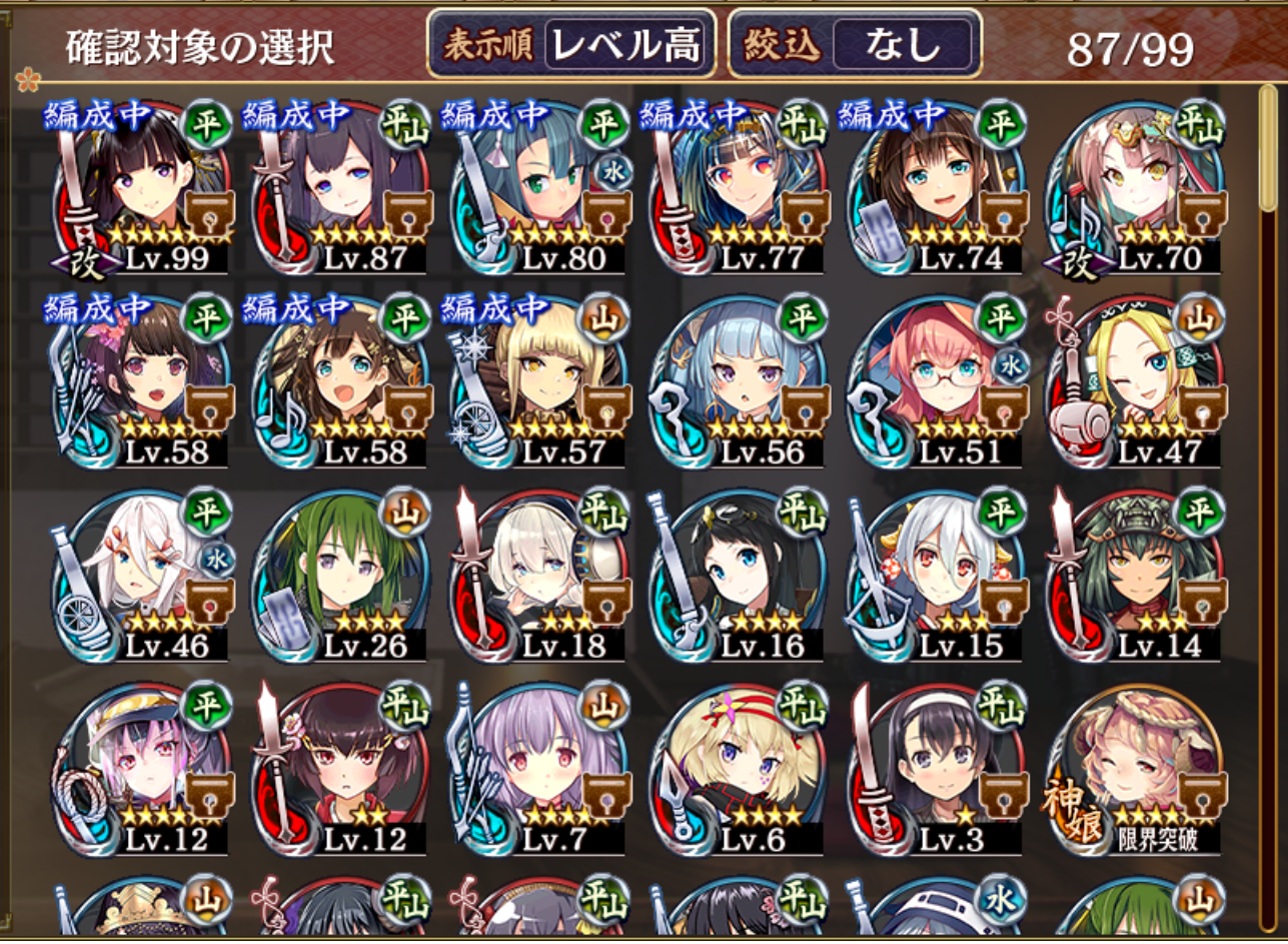 wikiのおかげで何とかここまで来ましたが、53話は歯が立ちません。最後までは行けるんですが、最後のボスと一緒に来るラッシュで押し切られて殿がやられてしまいます。手持ちユニットは画像の通りで、レベル高い子は全て好感度上げています。先輩方、何かいい手無いでしょうか?