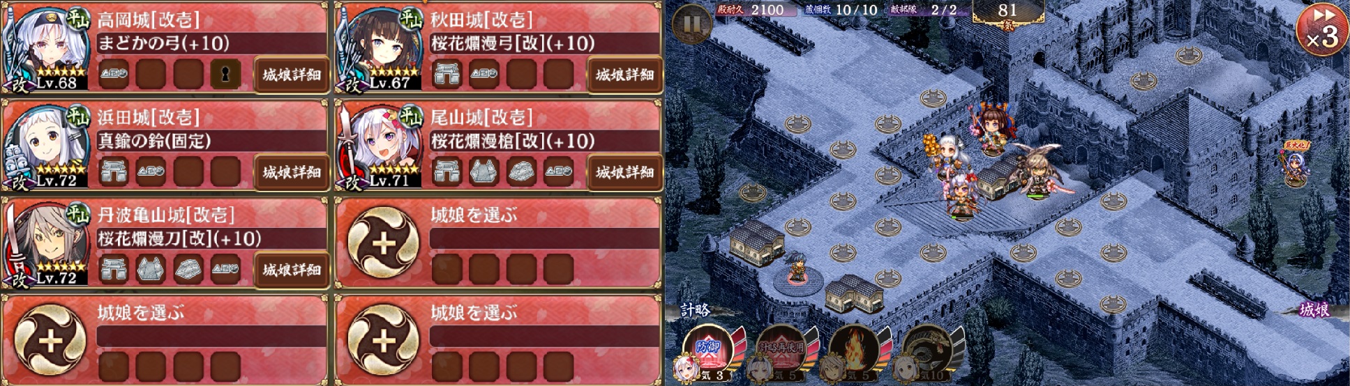 (※2)左側の蔵がヘラジカ兜に壊される前に倒しきれない場合は城娘達のレベル(主に攻撃の値)が低いと思われる。