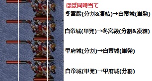 単発と分割の計略ダメージに関しまして気に掛かったので、自分なりに検証してみました。検証マップは、今週の週末復刻・懐古模倣の鋼獅子-絶弐-(開幕からしばらく動かない2体がちょうど良かったため)結論としましては、分割・単発・凍結の分割、問わず、最終的なダメージは同一となりました。つまり、敵に当てる計略で気に掛けるのは、同じ特殊効果のみ。直接ダメージ系は、どのタイミングだろうと何の気兼ねもなく計略を重ねられることがわかりました。冬宮殿は1軍に復帰。[ハロウィン]ケルフィリー城とのコンビで、平&水マップを攻略していきたいと思います。それでは