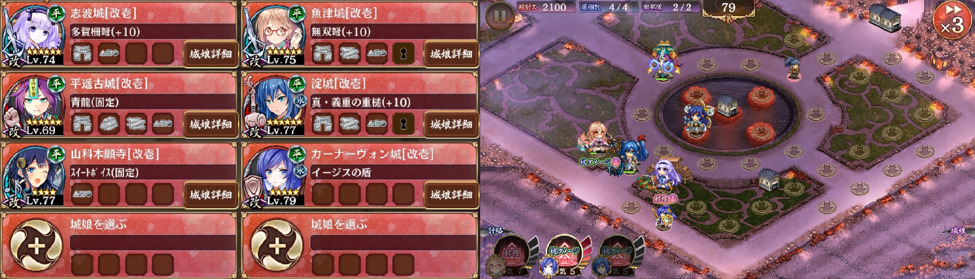 魚津と拳が疲弊しやすいため耐久重視。石弓の殲滅力と敵のハロウィンヴェルサイユの猛攻をいかに耐えるかが勝利の鍵となる。