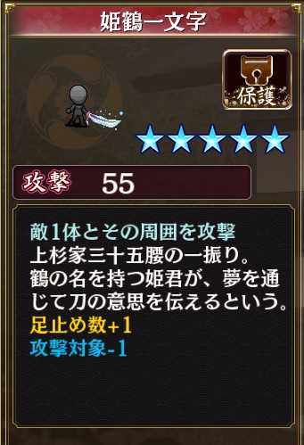 姫鶴一文字は、攻撃対象-1だが敵一体とその周囲を攻撃らしい。敵が密集してるなら攻撃対象-1は気にならないよね。