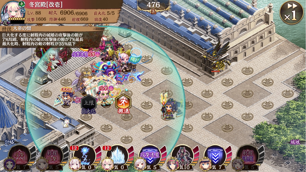 Wモンサンシャンティイダノター冬宮殿の図。射程+165で冬宮殿デバフが良い感じに機能して攻撃役の少なさは小峯で補う予定。攻撃50%攻撃+575でコンシェ(5.6倍)冬宮殿(4倍防御無視)シャンティイ(2.5倍防御無視)小峯達の計略も光る。