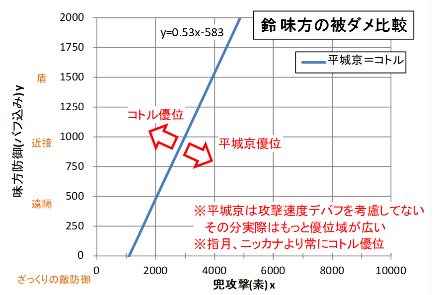 ついでに被ダメ軽減も比較した。そもそも雑魚は攻撃受ける前に倒すことが多く、攻撃高い(=大体すぐに倒せない)敵だけ考慮するとさすが平は魔境って感じ。ちなみに境界線付近はあんまり変わらないのでどっちでもいい領域。計算間違いがあったら教えてください。