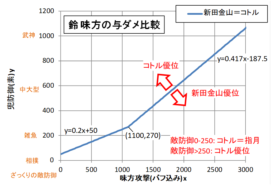 大変お恥ずかしい。仰る通りで、最初グラフ描いたときは低防御の雑魚なんてどうでも良いだろwと防御マイナス突き抜けを無視していたのですが、作り終わってから完全に忘れて相撲はどっちが効くか?みたいなこと考えておりました。修正しましたが、指月との比較が変わりすぎで酷い。ちなみに被ダメ比較の図は変わりません。(流石に最低保証は無視してます)