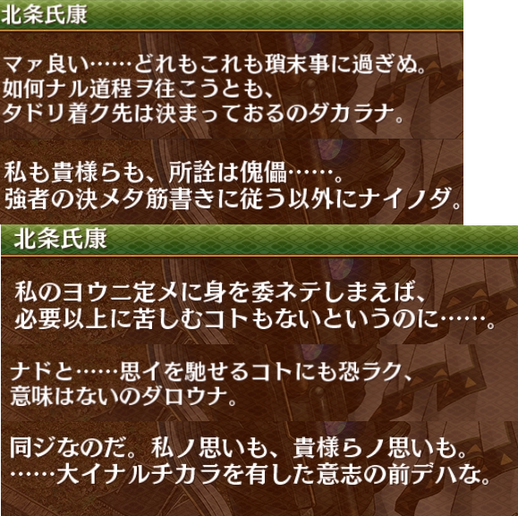 「宿命」に厭いた無気力マンなのは変わんないと思う 天一・討伐武将は宿命に従って戦うのはもうやだって感じだったけど、今回は兜の宿命に逆らうのももうやだになってる感じ 画像はどっちも今回