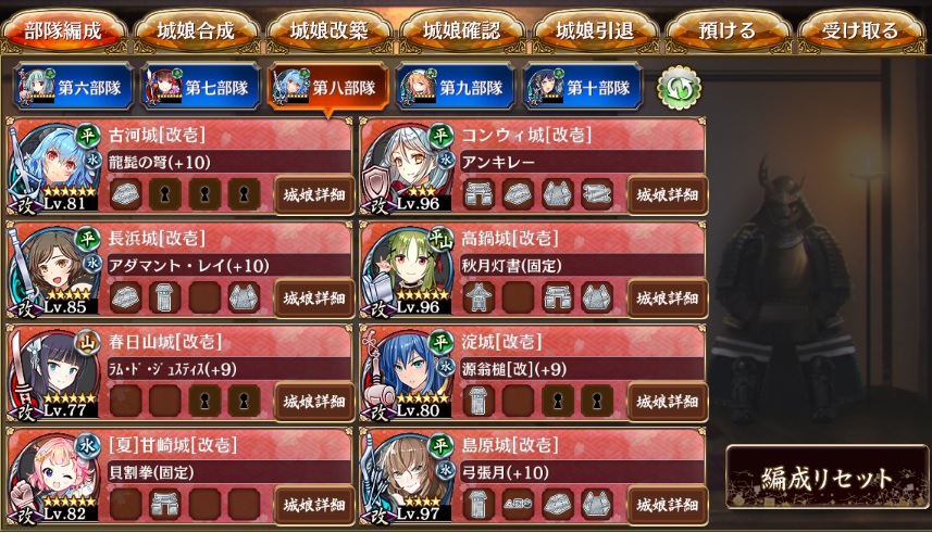 これで分かりますか?盾はコンウィ、後ろは夏甘崎。うちは、緊急・復刻系では絶でもあまり歌舞使わず巨大化でしのいでるので・・武神と天一の難しいの位で(先日の妖怪イベでは使用)。