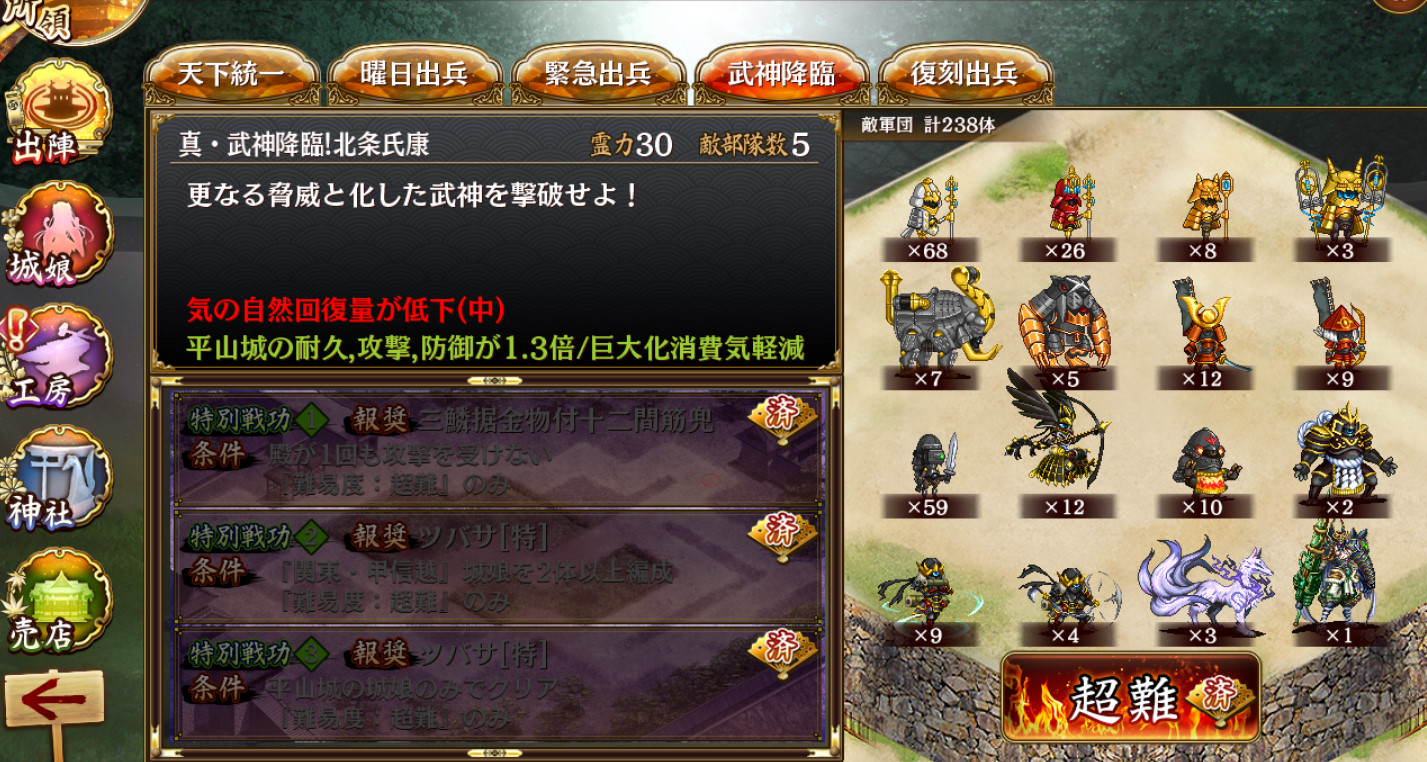 3枚抜きやっと達成、15小峰20甲府42彦根44木幡山伏見14ふっくー32肥前名護屋21コーブルク45白鳳で初手小峰最大化してふっくーを木幡の隠密となむなむで守って右下は白鳳の鈍足と彦根の横やりで封鎖、狐はコーブルクで止めて氏康は隠密なしの遠隔と近接2人のリレー、その後コーブルクは19に再配置して上の狐を足止め、下の狐は白鳳鈍足となむなむで始末、ふっくーのデバフが雑魚にも氏康にも中々効果的やったばい・・・