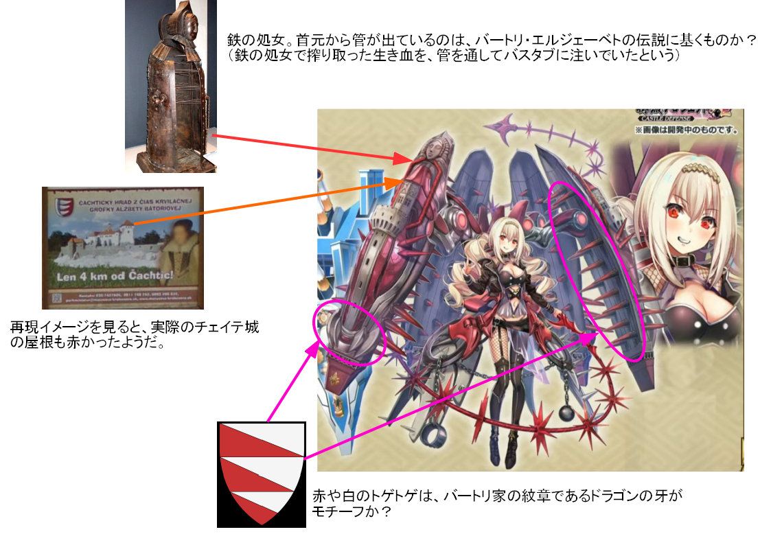 昨日の夜は勢いで書き込んだけど、もしもチェイテ城だとすると、理由になりそうなのはこんな感じだろうか?鉄の処女以外は、けっこうこじつけ感強いけど…