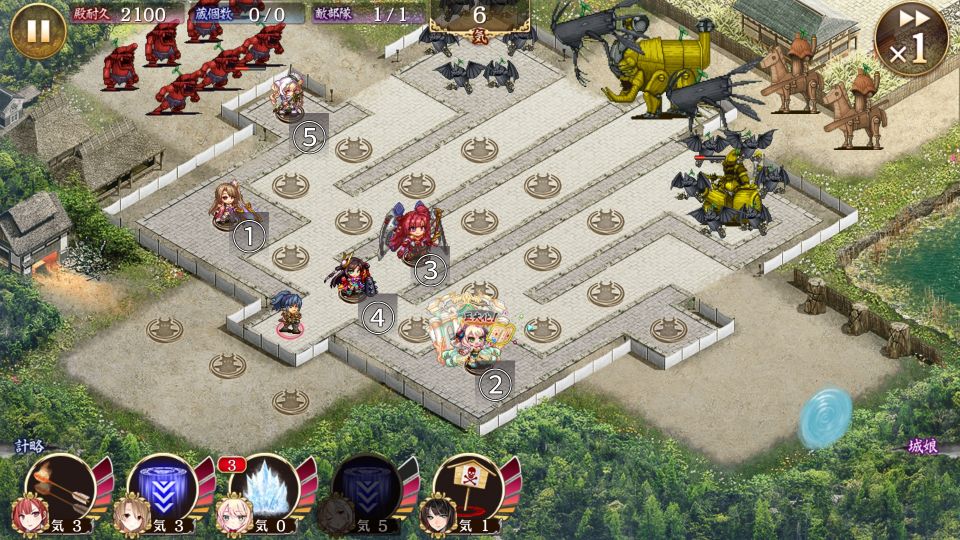 大砲に岩殿山城の混乱かけて大きな敵は殲滅する感じで、2と1の場所を入れ替えてもクリア可能。