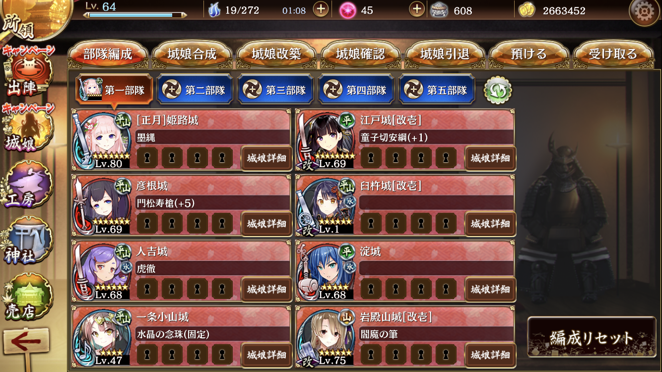 木主です。皆さんのおかげで難易度[離]をクリアすることができました笑。ありがとうございますm(__)m そんで臼杵城を手に入れたのですが、金亀とどちらが良いですか?ついでに、現在、淀城を育ててるんですけど鶴丸と交換した方が良いですかね?wiki見てたら鶴丸の方が攻撃的だなぁと思い淀城と迷ってしまいました。質問ばかりで恐縮なのですが、何卒よろしくお願いいたします。ちなみにこれから大阪城を取りに行く予定です。五周年はもう少し我慢しようと思います。