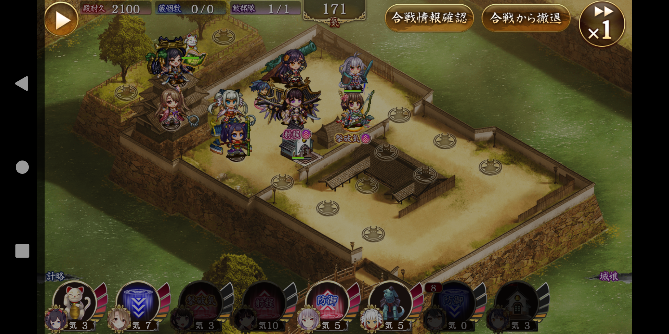 全員改築済みなので参考になるかは分かりませんが、その分武器は持たせていません。初手で柳御所を最大化して、御所と臼杵の計略を使えば気が潤沢に余るので楽にクリアできそうです。鷹と佐竹虫には足利学校の計略を使いました。