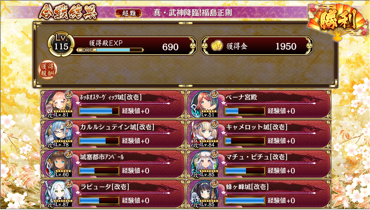 動画やここのアドバイスとにらめっこしてやっと勝てた。殿ノーダメ大破無し。ログボ券でアンベール引いたからキャメベールが組める!ってなってやる気を出し、虎臥、ノイシュ、千早、コトルは未所持なので無しでもなんとかしようと度重なる敗北の末に勝利。城娘のみんなも、ここのみんなも、動画の人もありがとう……ありがとう