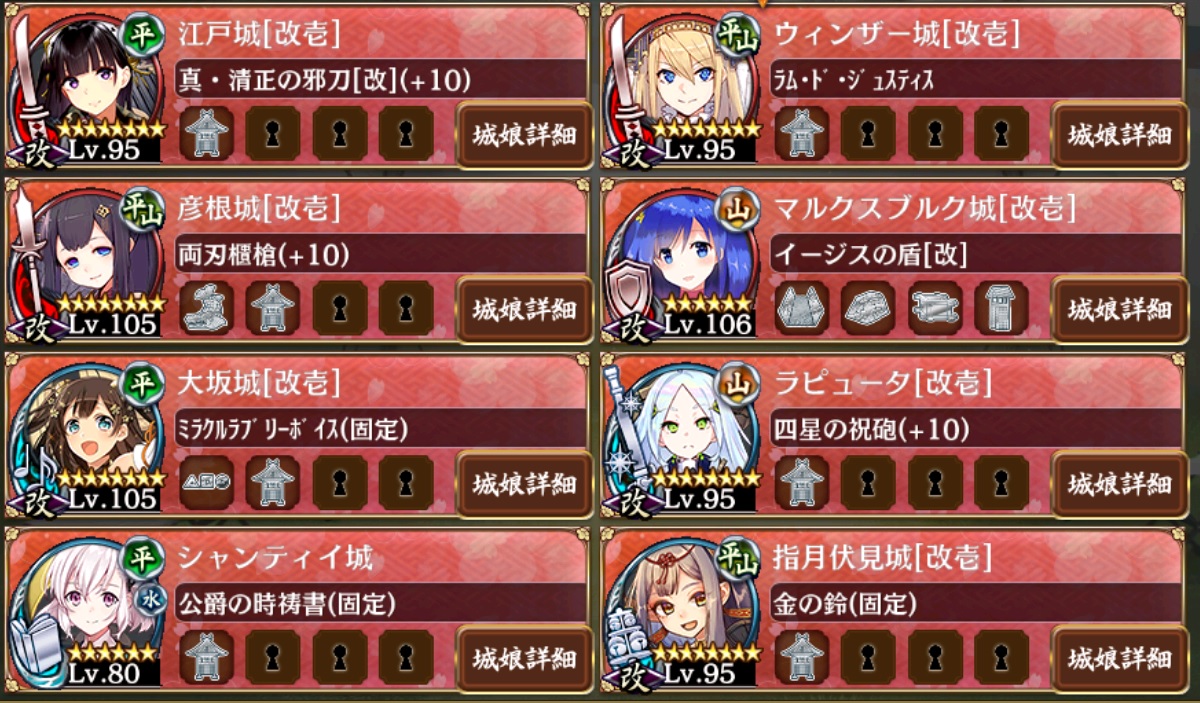 この編成でやってるんだけど、もうちょっとで詰まる。配置は、33シャンティイ→27江戸→32彦根→24ラピュータ→23指月伏見→28大阪→35ウィンザー31マルクスブルク。5Wで山県は何とかなるけど、左から回り込む赤力士がどうにもならん。なお、ウィンザー入れてるのは、シャンティイに計略かけて2倍撃喰らわせる為。チャンドラ入れたり、[夏]名古屋入れたり色々やったけど、このやり方が一番進んでる。
