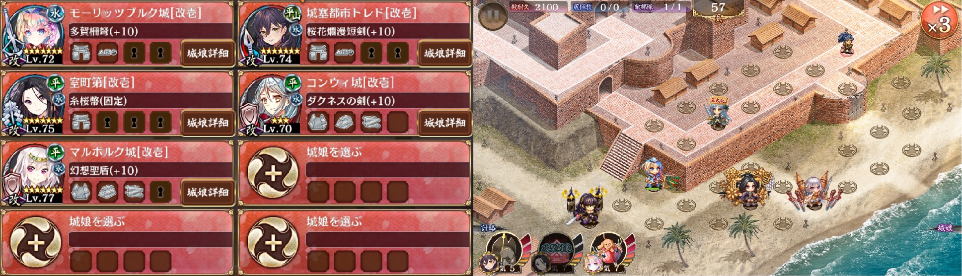 (※3)非常に重要な場面。初期位置の中央にいる強化型一ノ谷形兜は攻撃を受けるたび射程が上昇する。下手に攻撃して倒そうにも城娘の攻撃の値が低いと逆に返り討ちに遭う。室町第には優秀な計略があるがそれでも追いつかない。この兜への攻撃を始めるには串の特技発動によって攻撃バフが乗っている状態がふさわしい。そのためには強化型一ノ谷形兜へ攻撃を与えずに特技発動をさせる必要があるため、暗闇状態で串を巨大化させる方法を採用した。